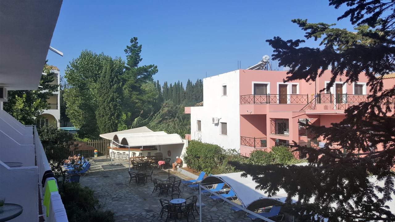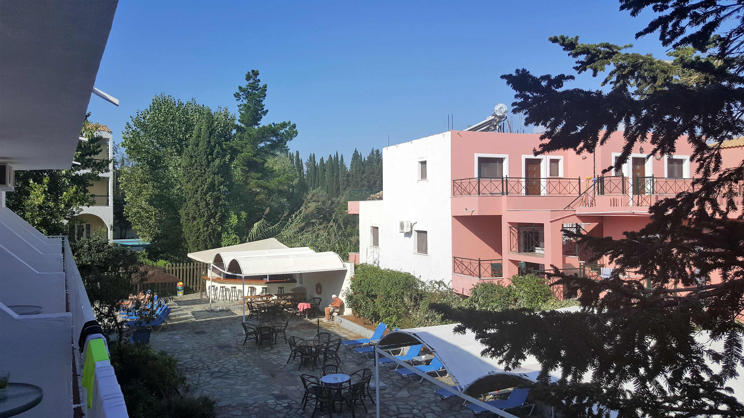 Blick auf den Pool und Bar vom Balkon.