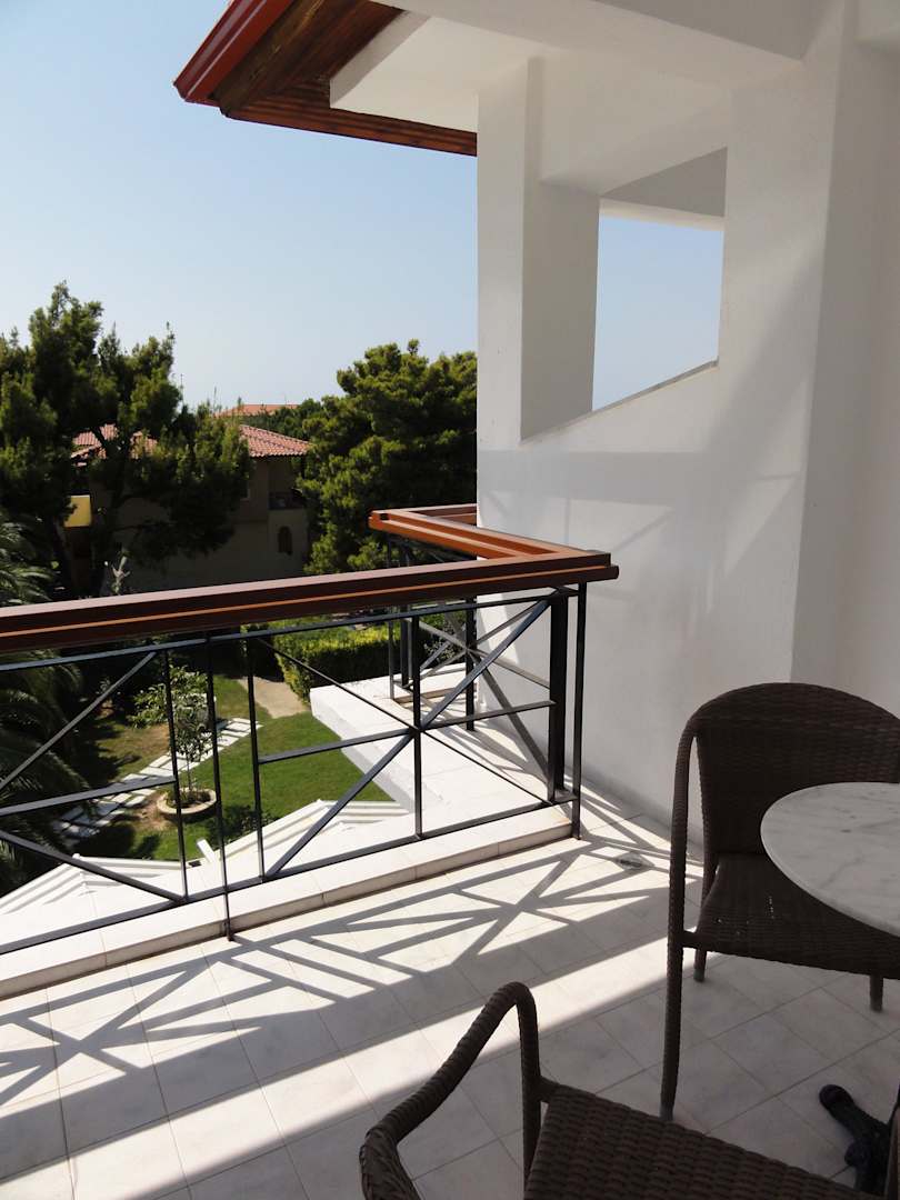 Blick vom Balkon über den Hotelpark bis zum Meer