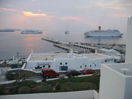 Hotel Porto MykonosKreuzfahrtschiffe "auf Reede" direkt vor dem Hotelbalkon sind keine Seltenheit und eine sehr interessante Abwechslung!