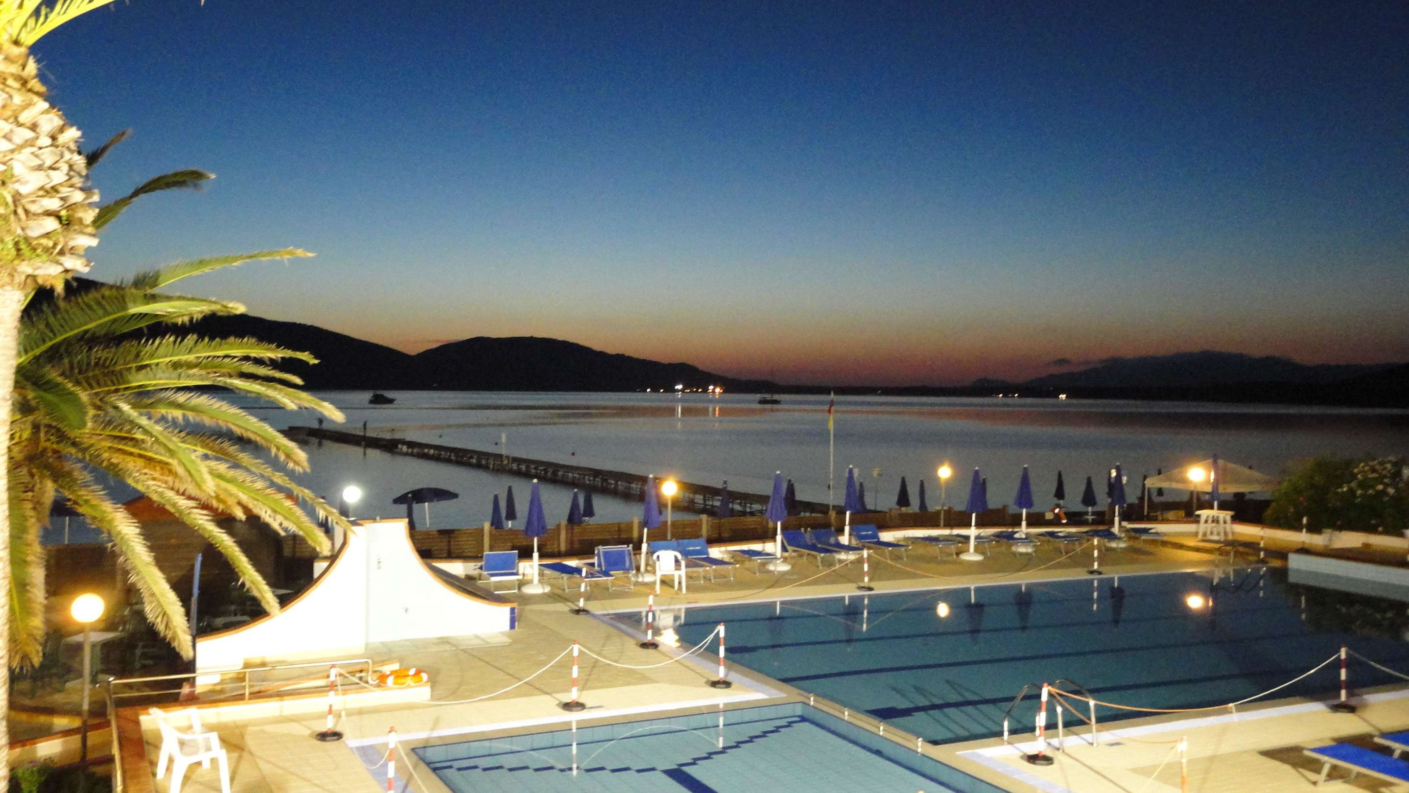Ausblick von der Terrasse auf Pool und Strand