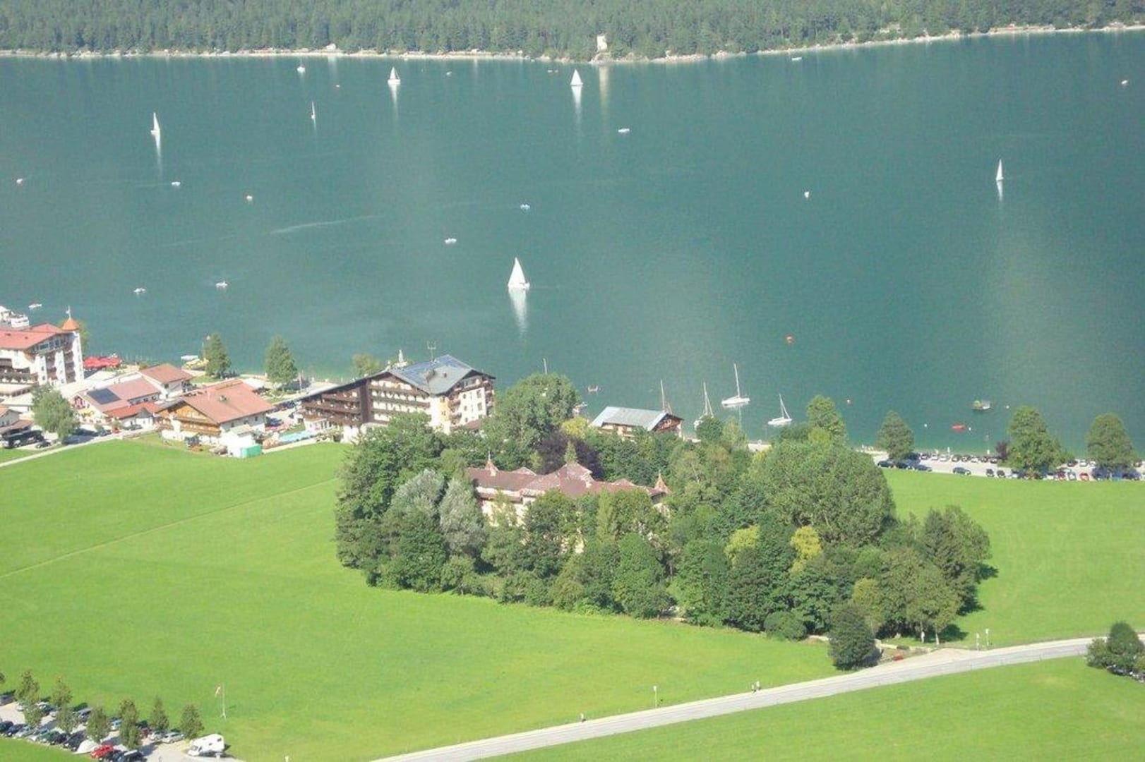 Die "Post am See" von obenDiesen Blick auf die Rückseite des Hotels "Post am See" genießt man, wenn man mit der Karwendelbahn nach oben schwebt.