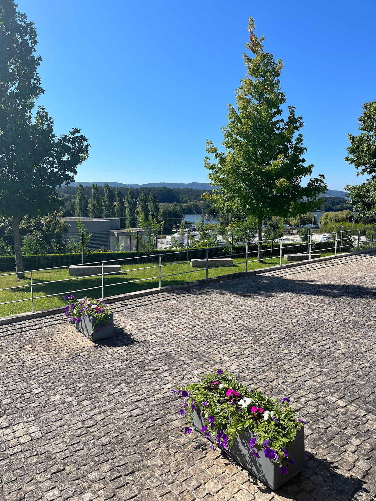 Blick zum Fluss und Park von Hinterhof der Herberge