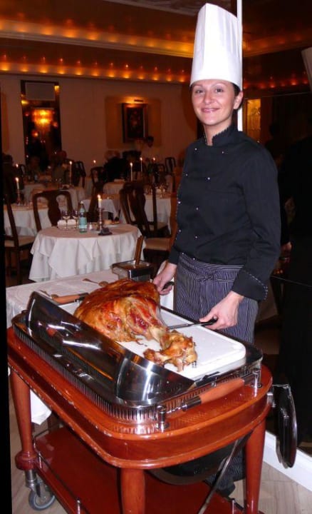 Im Speisesaal eine der netten Servicekräfte beim trancieren des Knochenschinkens