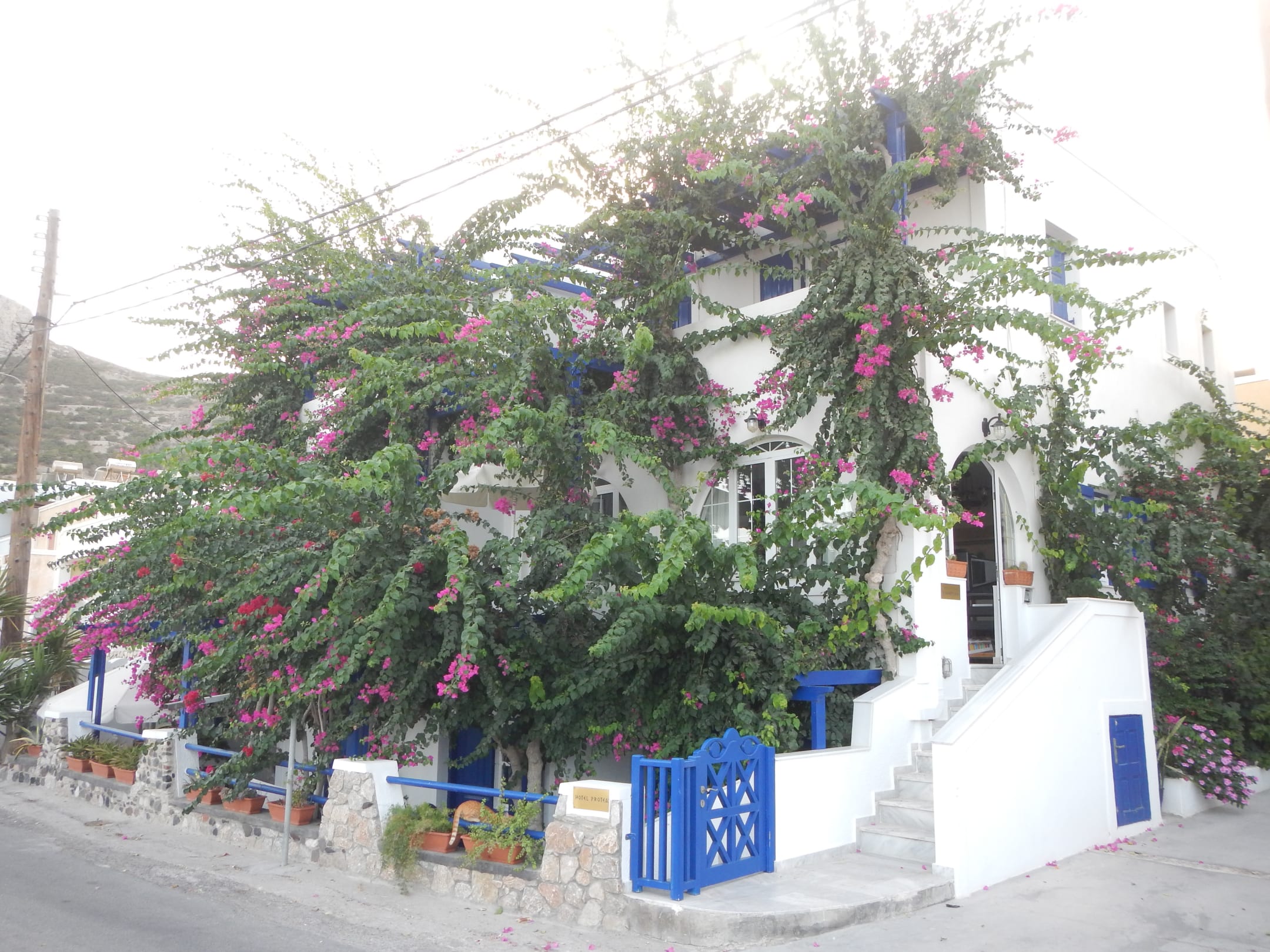 AußenansichtHotel Proteas von außen - sehr blumenreich (Abgang zu unserem Zimmer: das blaue Gartentor mittig im Bild)