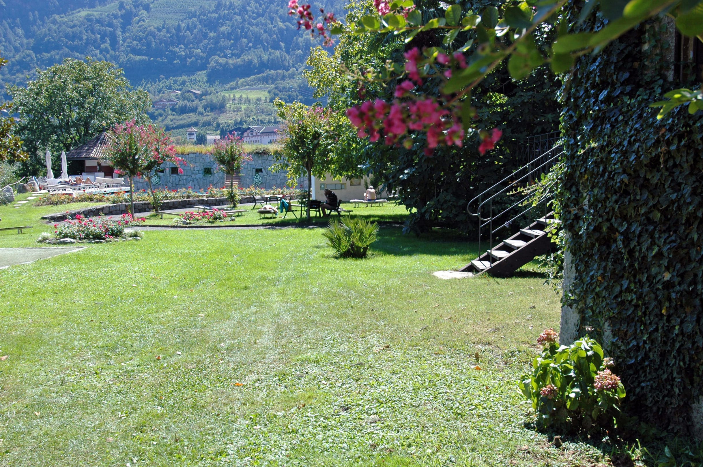 Blick in die Außenanlagen mit Pool Hotel Pünthof