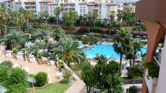 Poolanlage und Cafeterrasse vom Dach