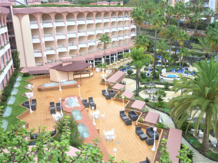 Ausblick auf Terrassen und Pool Rückseite des 4 Stockwerke Hotels
