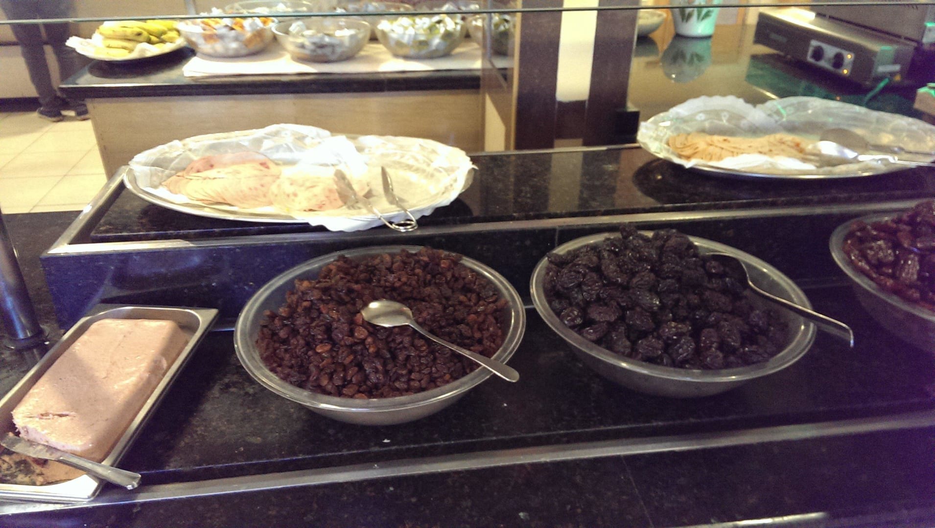 Frühstück, Wurst, riesige Schüsseln TrockenobstSo sah das Frühstücksbuffet jeden Tag aus. Bon Appétit!