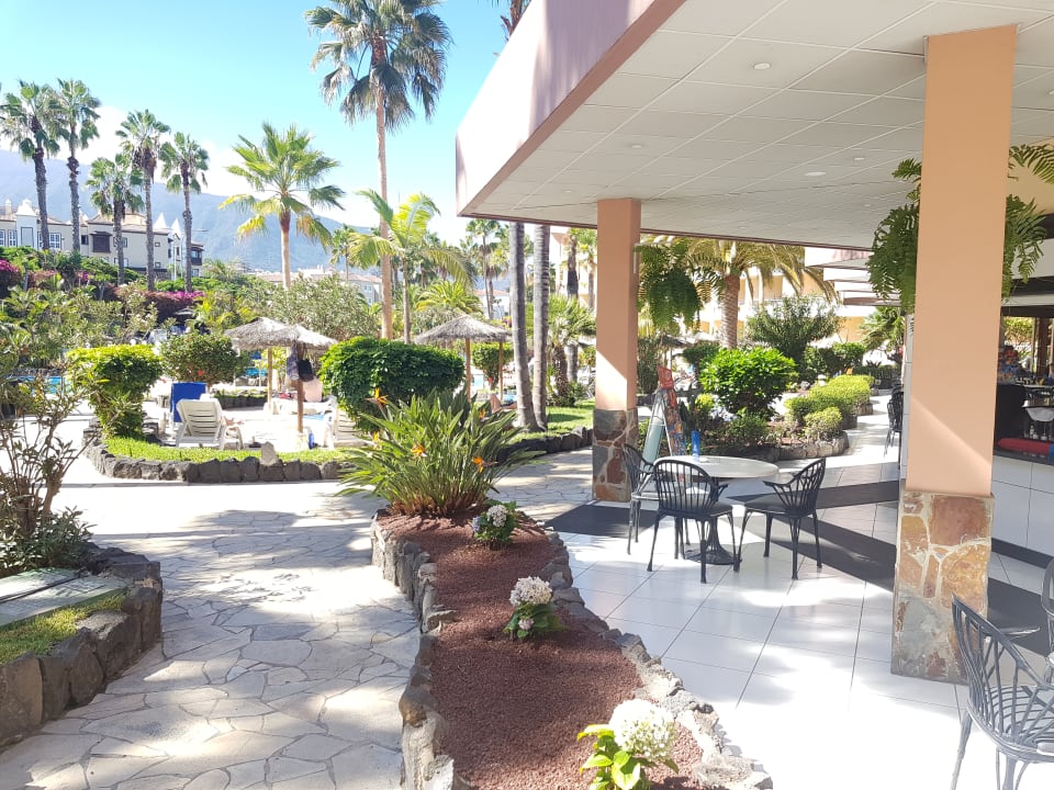 Links Poolanlage, rechts Poolbar