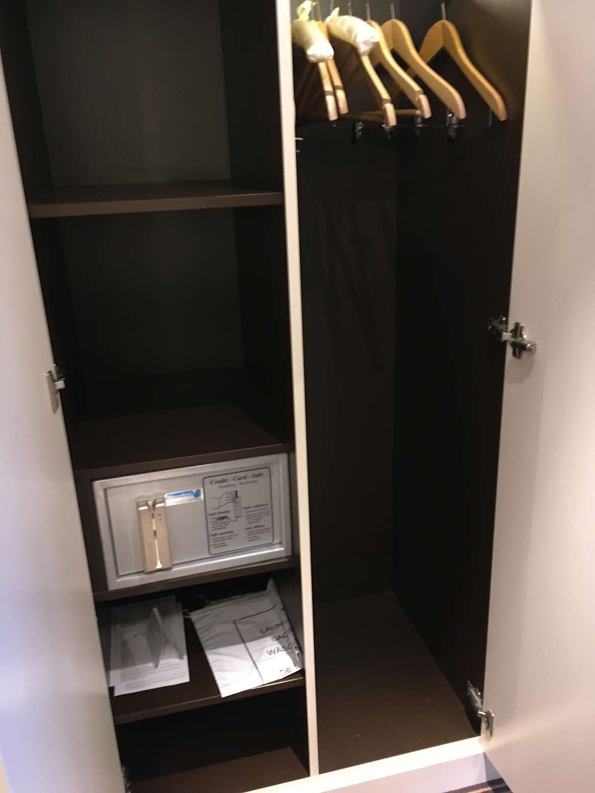 ZimmerSchrank von überschaubarer Größe, aber echte Kleiderbügel und ein Safe, den man mit der Kreditkarte verschließen kann.