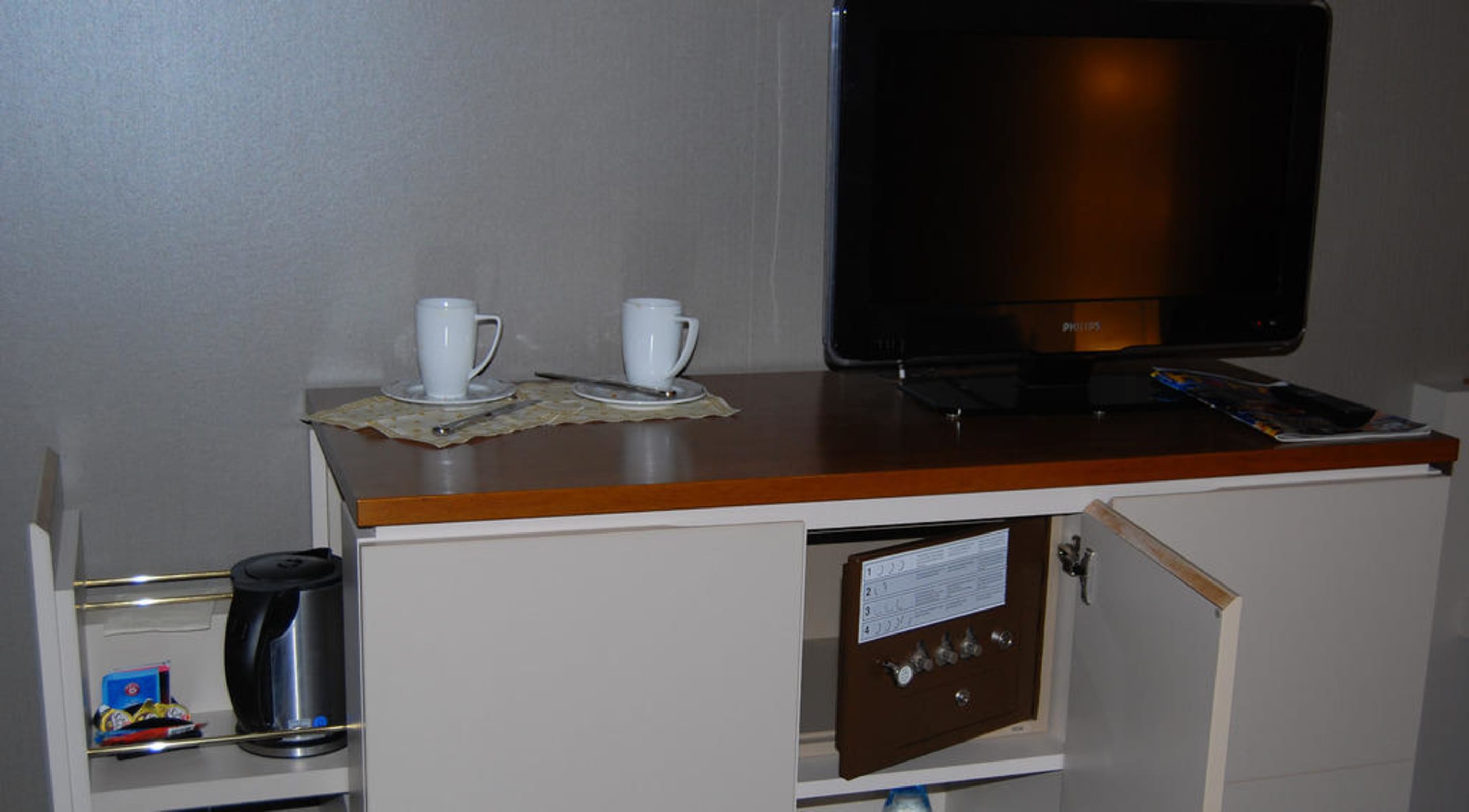 Schrank mit Safe und KaffeezubereitungPraktisch ist das Sideboard im Zimmer mit dem kostenlosen Safe und der Möglichkeit, Tee und Kaffee zuzubereiten
