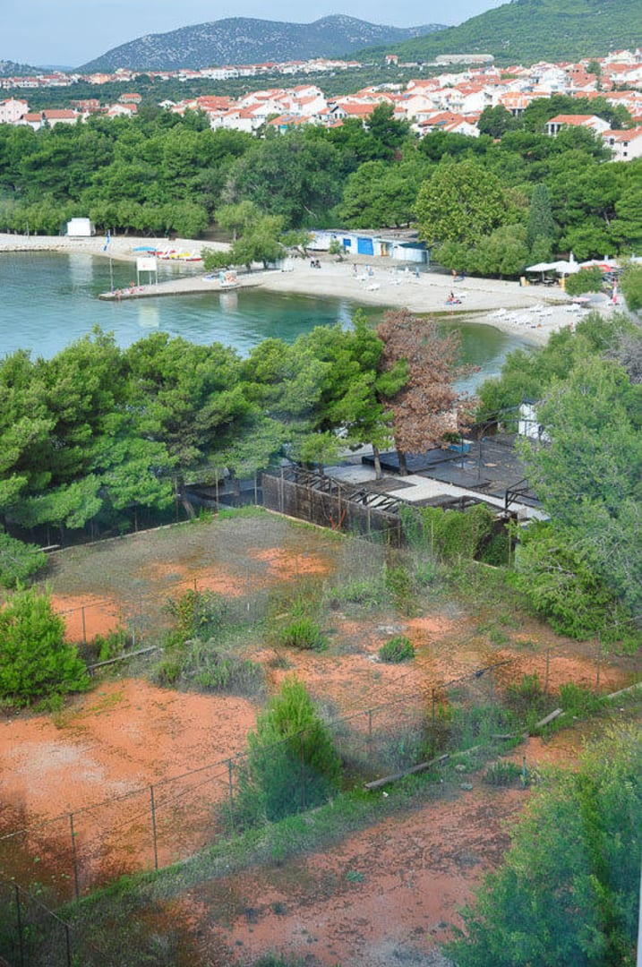 Völlig verwahrloster TennisplatzDas war mal ein Tennisplatz, im Hintergrund die Strandbucht.