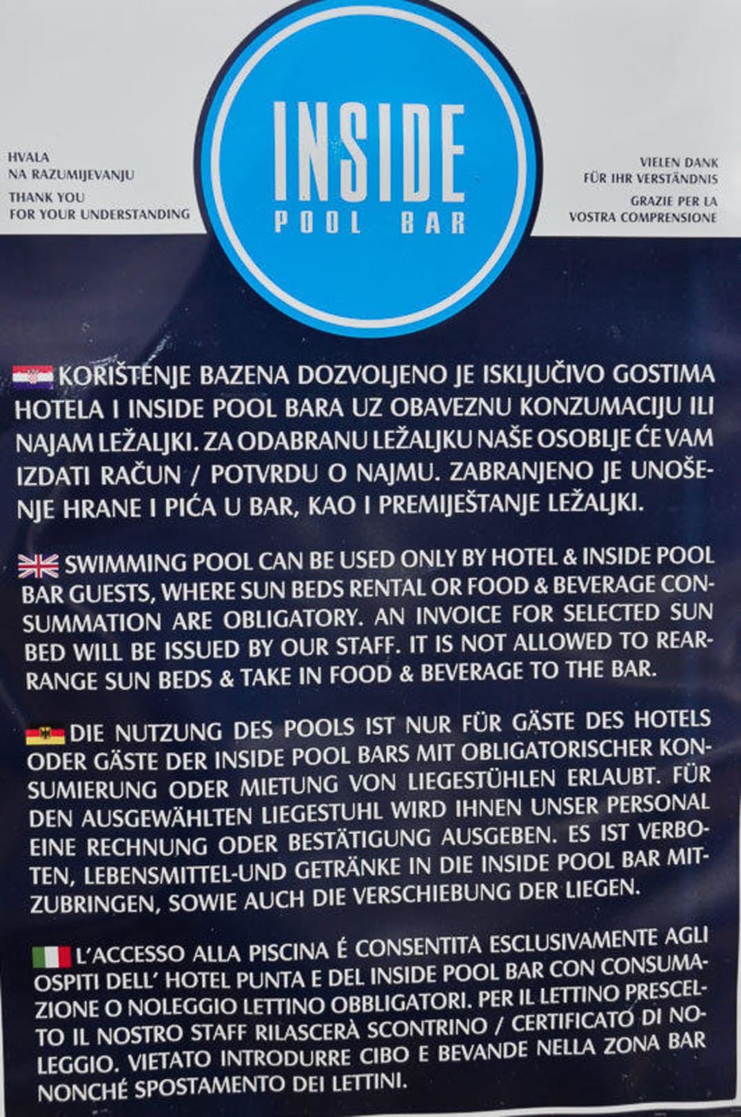 Damit auch in jeder Sprache klar ist, dass die Liegen kostenpflichtig sind, zusätzlich kann man noch nicht mal sein eigenes Getränk dabei haben.