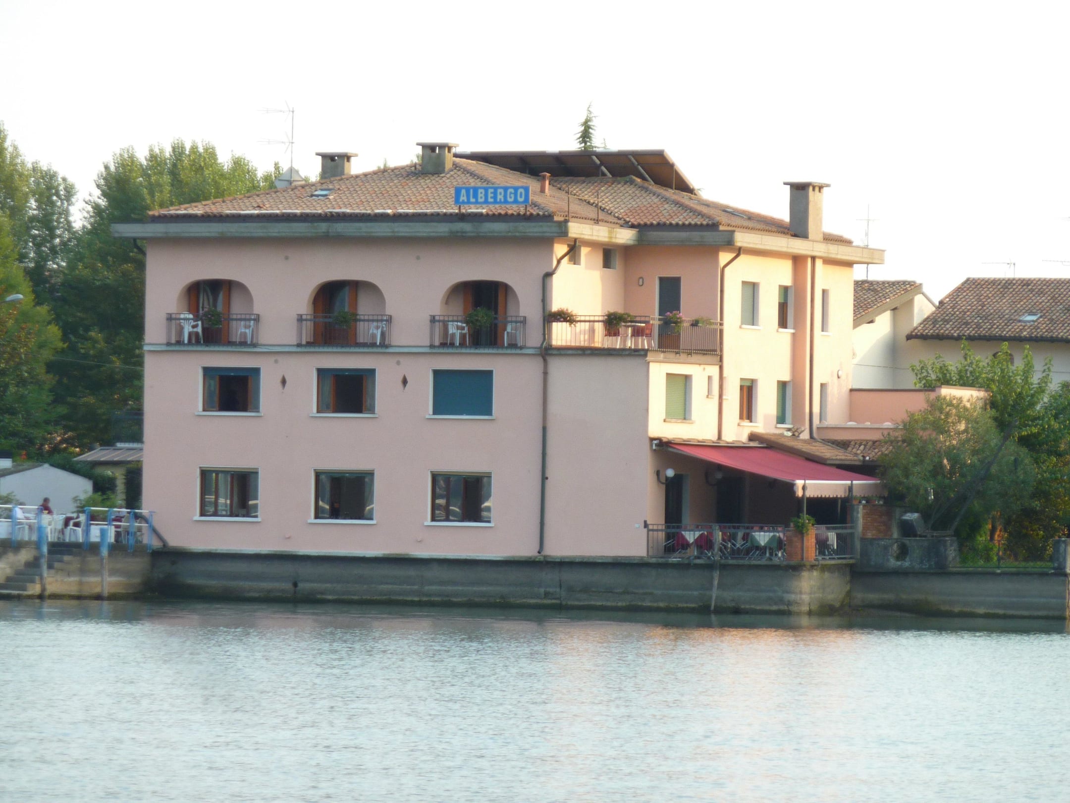 Ansicht des Hotels mit der Terrasse des Restaurants (rechts unter der roten Markise). Weitere Tische befinden sich vor dem Hotel am Anleger.
