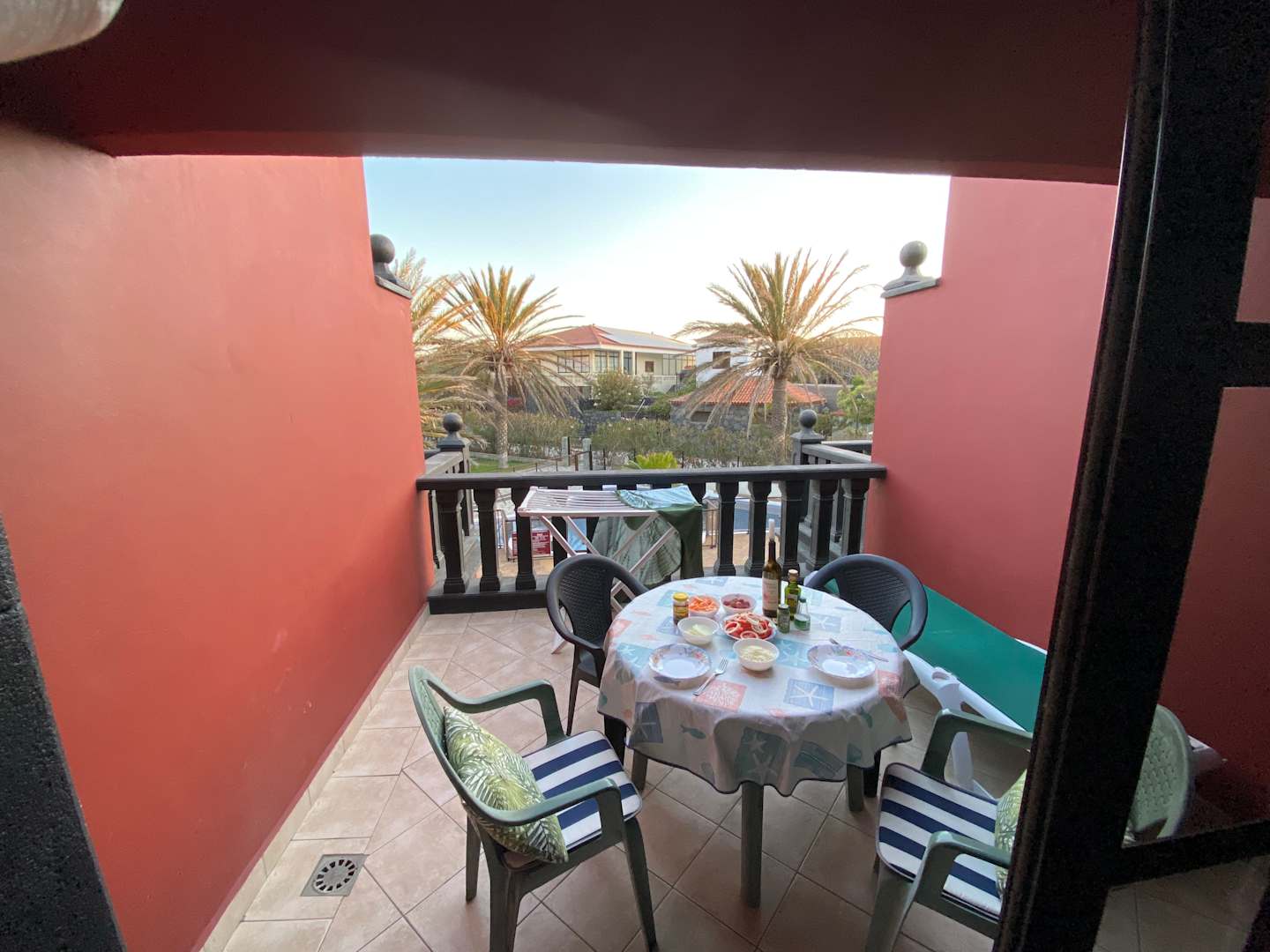 Zimmer 24, der große Balkon mit Ausblick Richtung Pool.