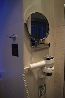 Kosmetik-Spiegel und Föhn an der Wand...