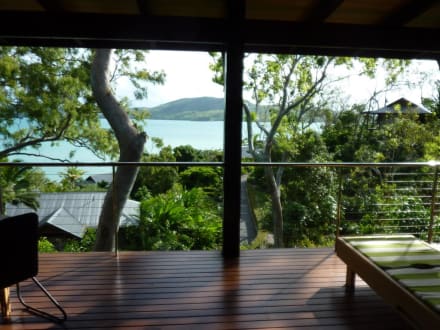 Blick vom Balkon auf das Meer und den Garten