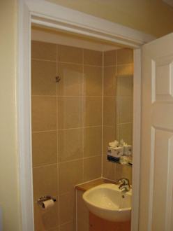 Blick ins Badezimmer in Richtung Waschbecken