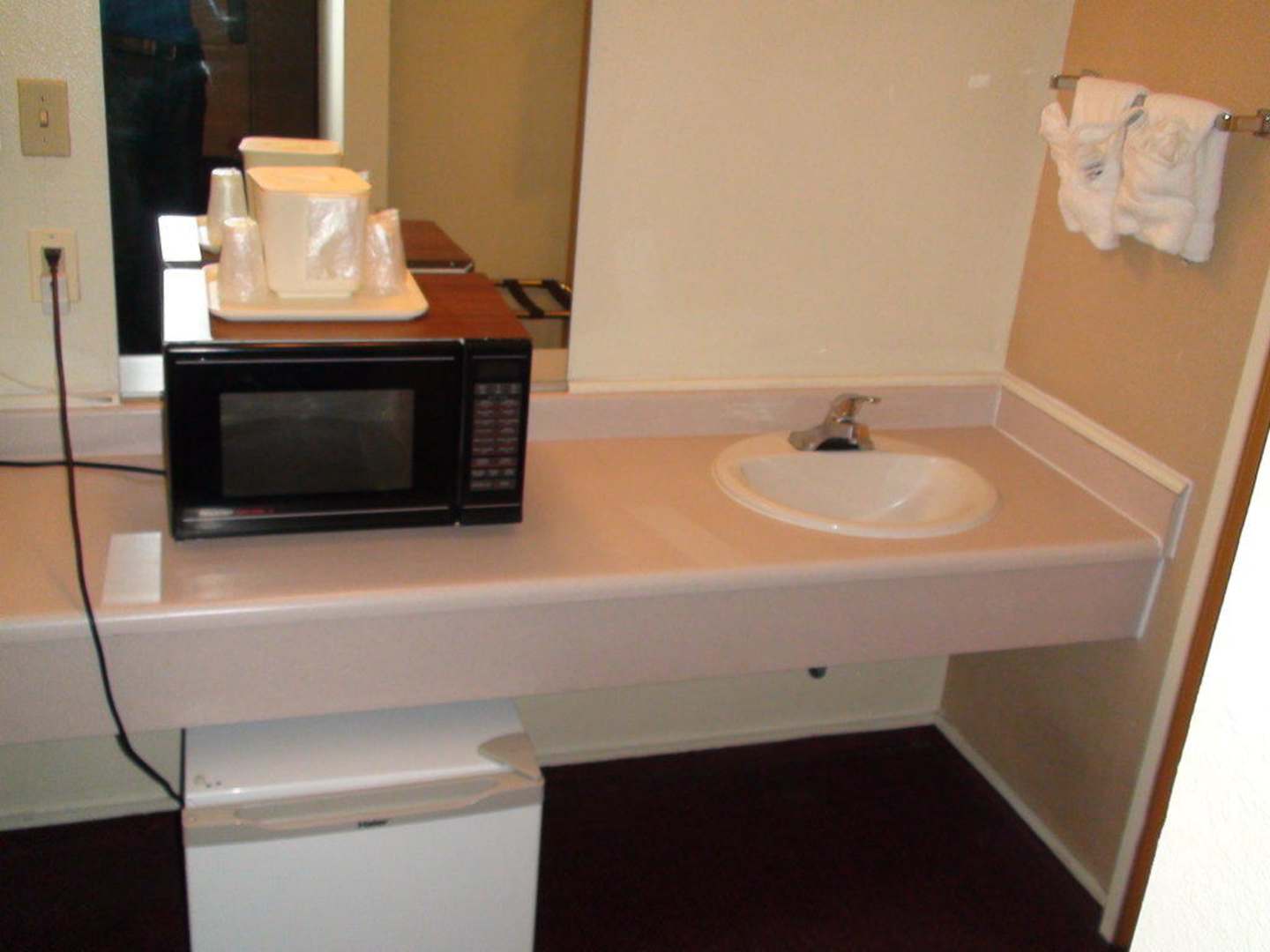 Zusätzliches WaschbeckenVor dem Badezimmer gibt es ein zusätzliches Waschbecken außerdem einen Kühlschrank und eine Mikrowelle.
