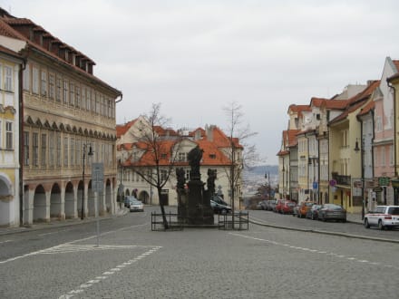 Blick von der Straßenbahnhaltestelle. Rechte Seite hinter dem letzten Haus steht das Hotel. Linke Seite die Straße herunter geht es zum Hradschin.