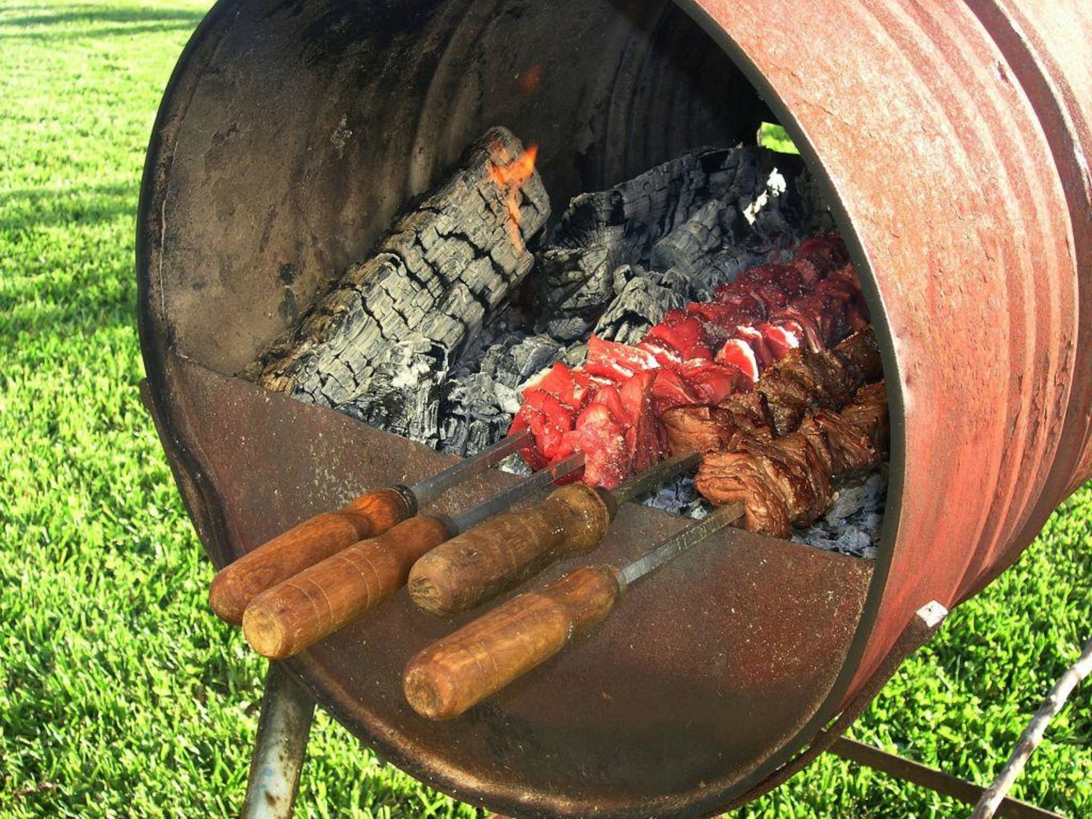 In dieser Tonne werden die leckeren Fleischspieße (Espetada) gegrillt