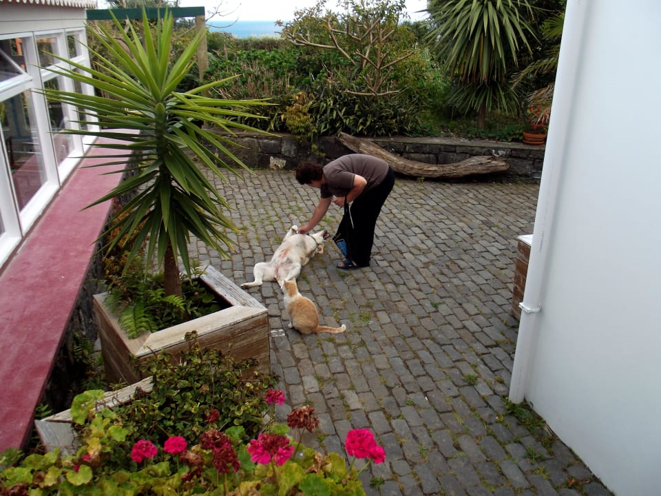 Ein sehr treuer, anhänglicher Haus-und Hofhund,aber trotzdem sehr wachsam. Und eine der im Hotelgelände allgegenwärtigen Katzen.