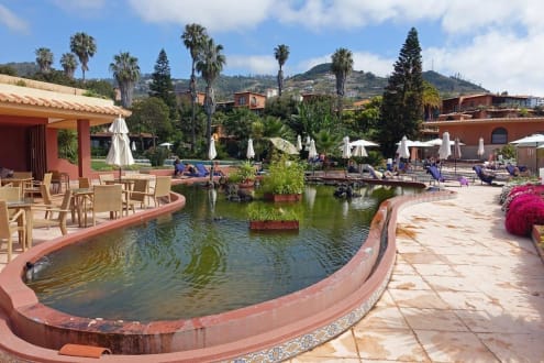 Teich mit Fröschen vor dem Poolrestaurant