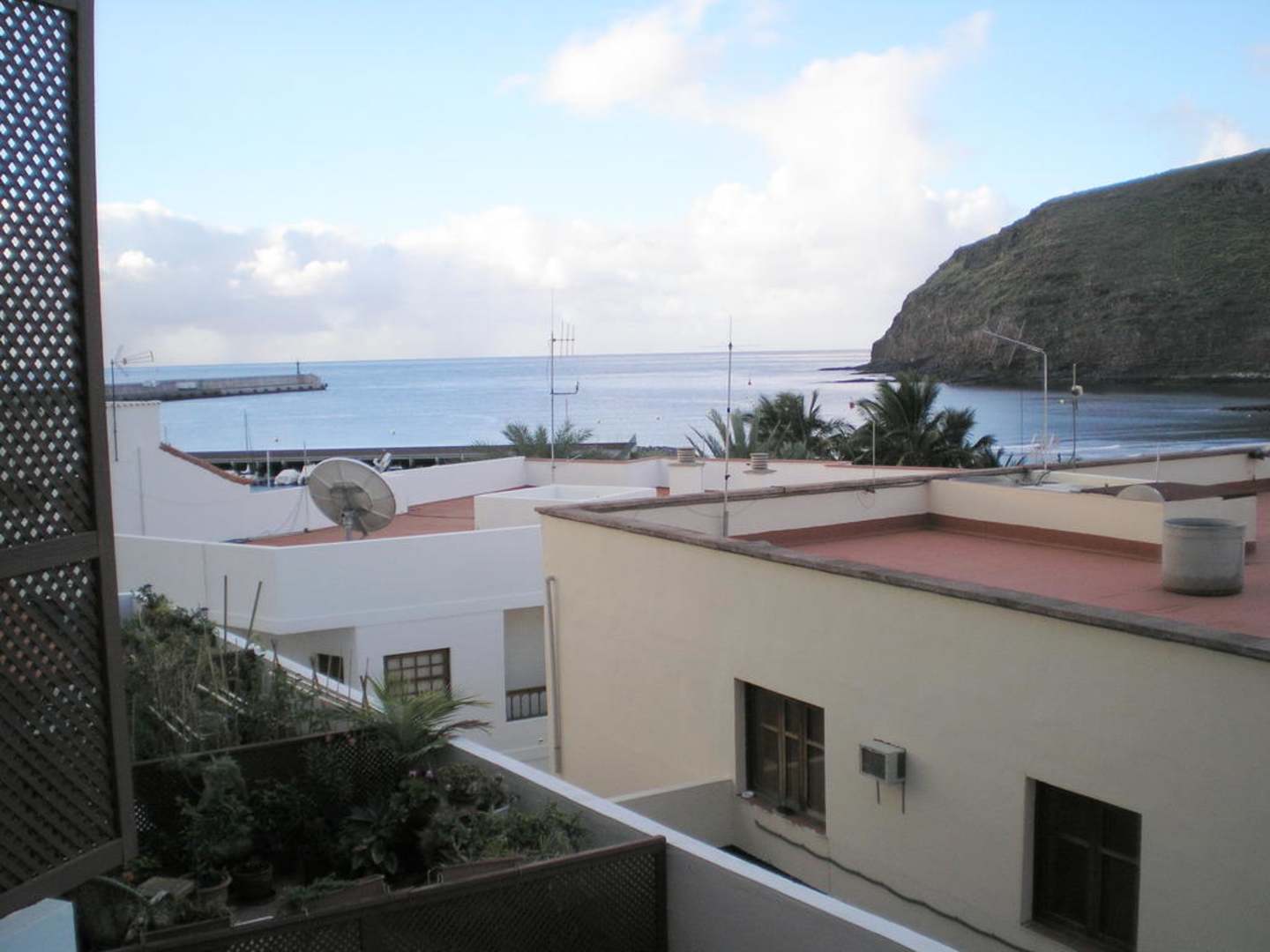 Von den Balkonen aus blickt man seitlichauf das Meer und den schwarzen Strand und kann auch die ein-. und auslaufenden Schiffe beobachten