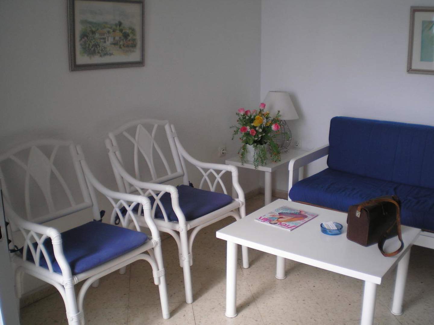 Im Wohnzimmer gibt es neben Stühlen auch eine Ausziehcouch