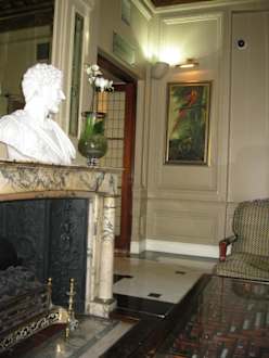 Kamin neben den Sitzmöglichkeiten im Empfangsbereich