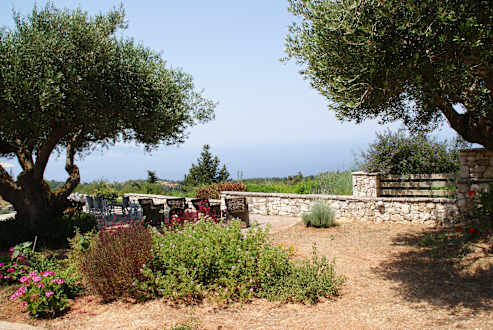 Sitzgelegenheiten unter Olivenbäumen mit direktem Blick auf das Meer