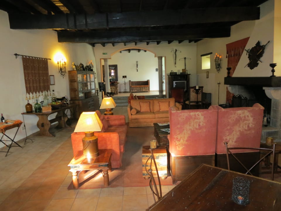 Bar mit Kaminfeuer und Lobby im Hintergrund