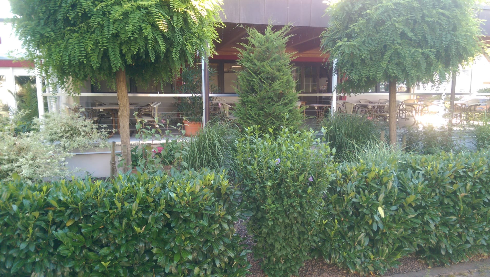 Blick auf die schön bewachsene Terrasse