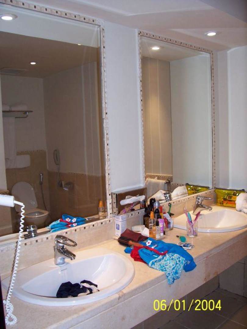 Goldbesetzte Bordüren um den Spiegel - aber die Wandfarbe, welche beim Pinseln versehentlich drübergemalt wurde, wurde nicht entfernt ... Schlamper!