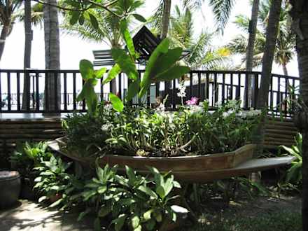 Orchideenein mit wunderschönen Orchideen bepflanztel Boot steht an der Treppe zur Frühstücksterasse