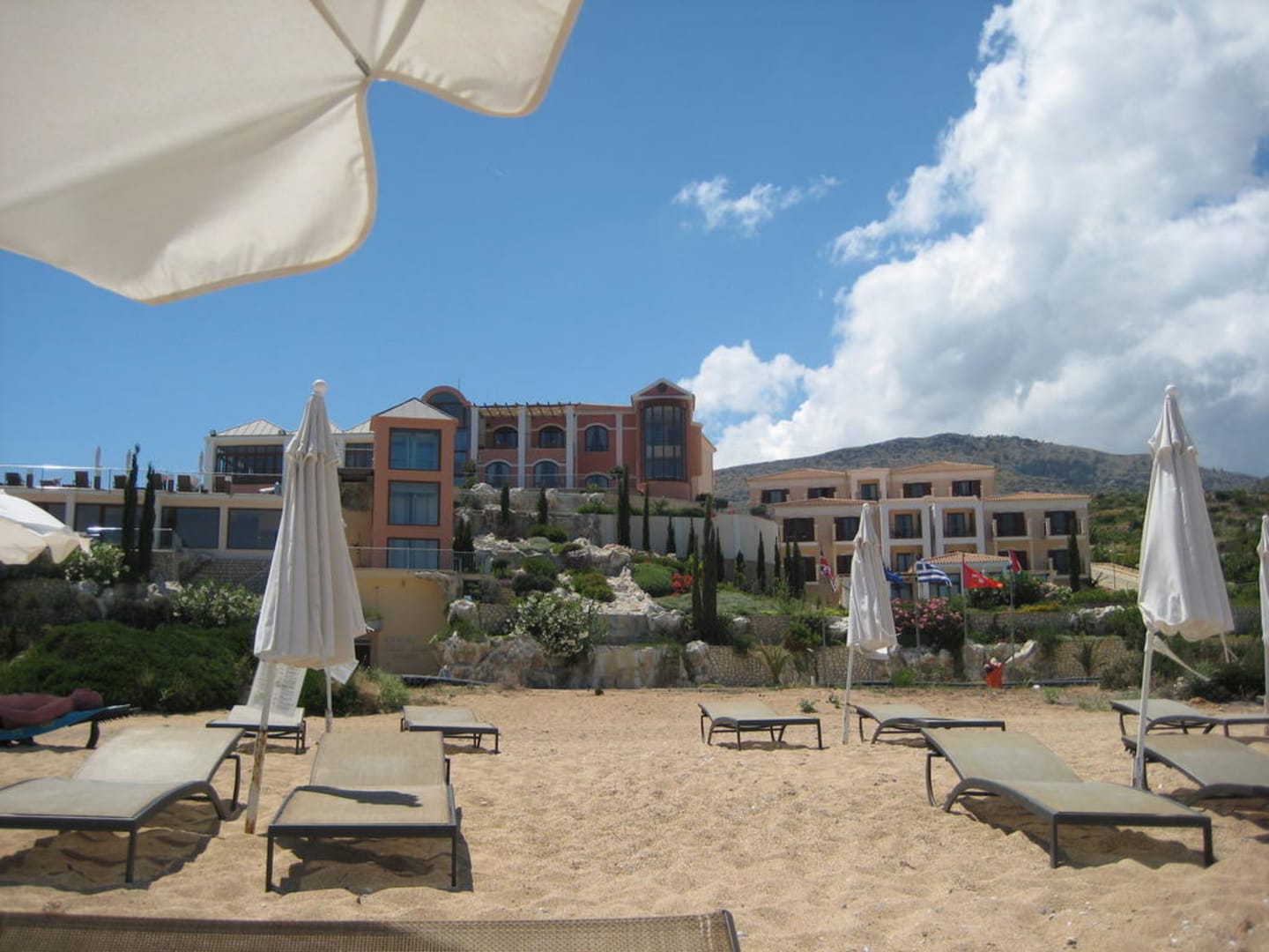 Hotel vom Strand aus gesehenzwischen Hotel und Strand verläuft die Strasse. Es hatte aber sehr wenig Verkehr. Der Strand ist ein Sand-Kieselstrand daher war das Meer richtig sauber und türkisblau. Die Liegestühle sind kostenlos zu benutzen