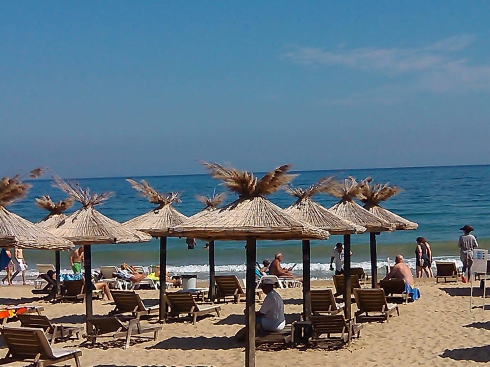 Feiner Sandstrand mit Liegen, Auflagen und Schirmen