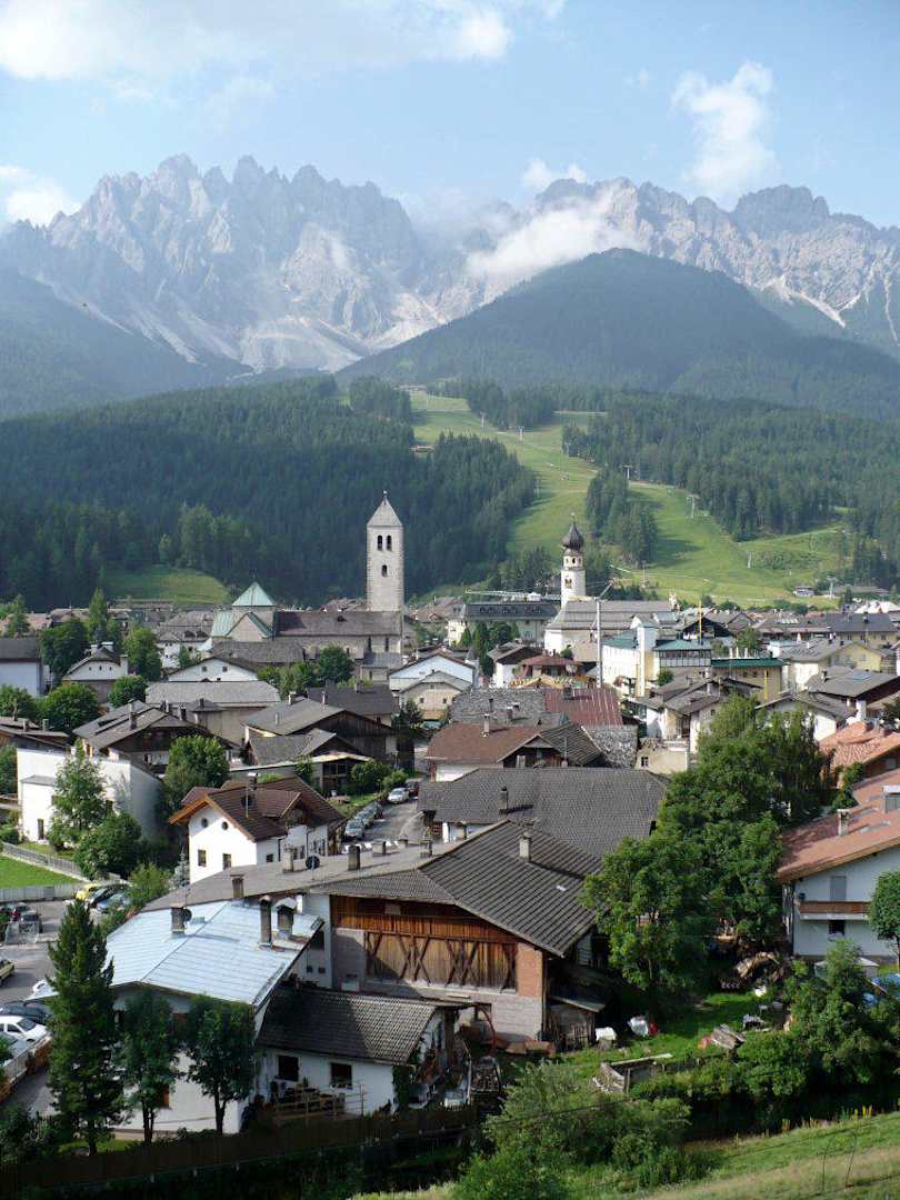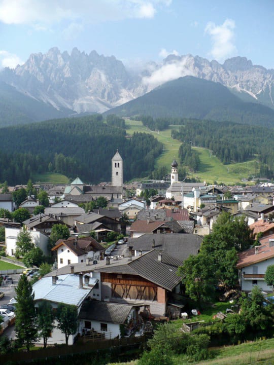 Blick über Innichen mit Skipisten