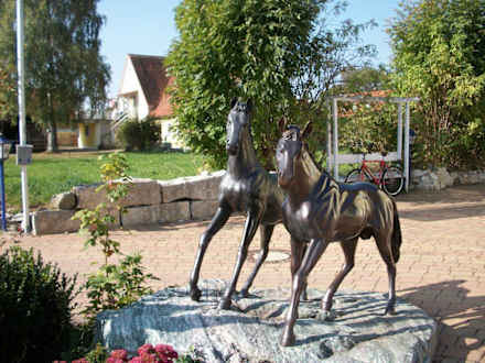 Die beiden Pferde befinden sich vor dem Eingang neben den außen sitzgelegenheiten.