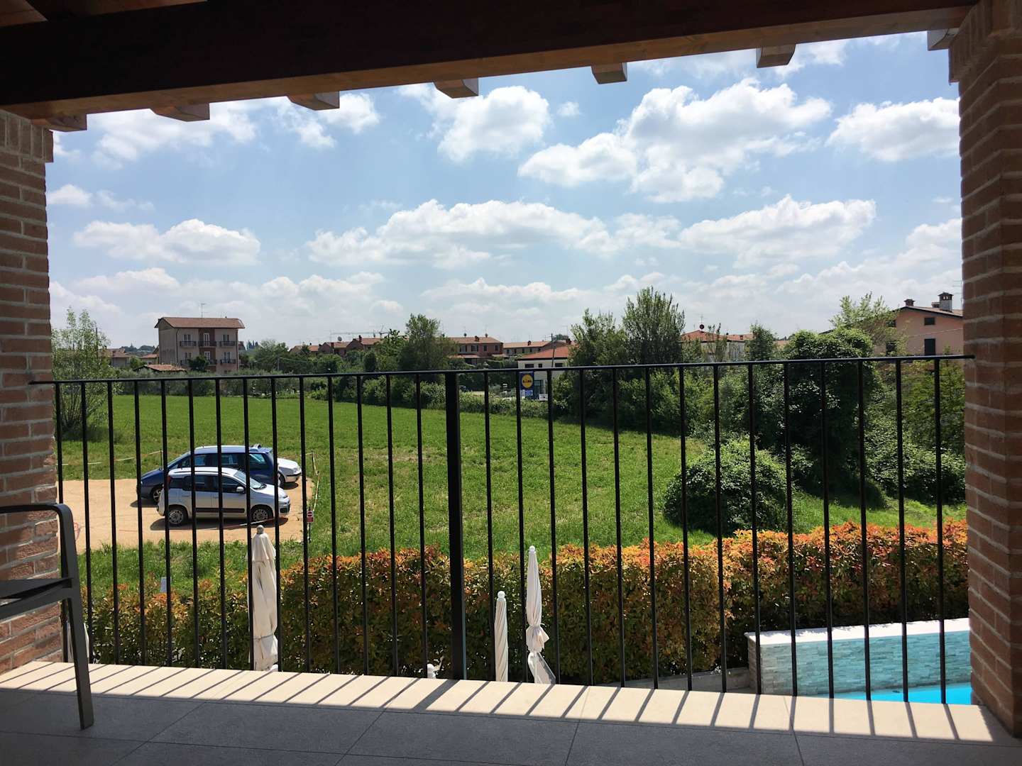 Blick zum Pool + Parkplatz