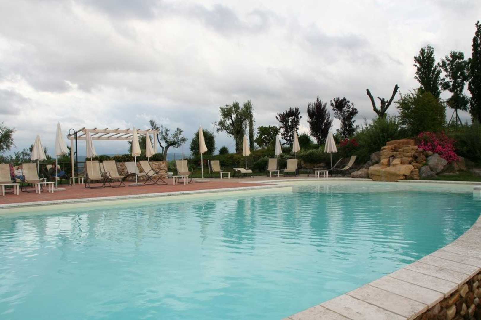 Blick vom Garten auf die Poolanlage