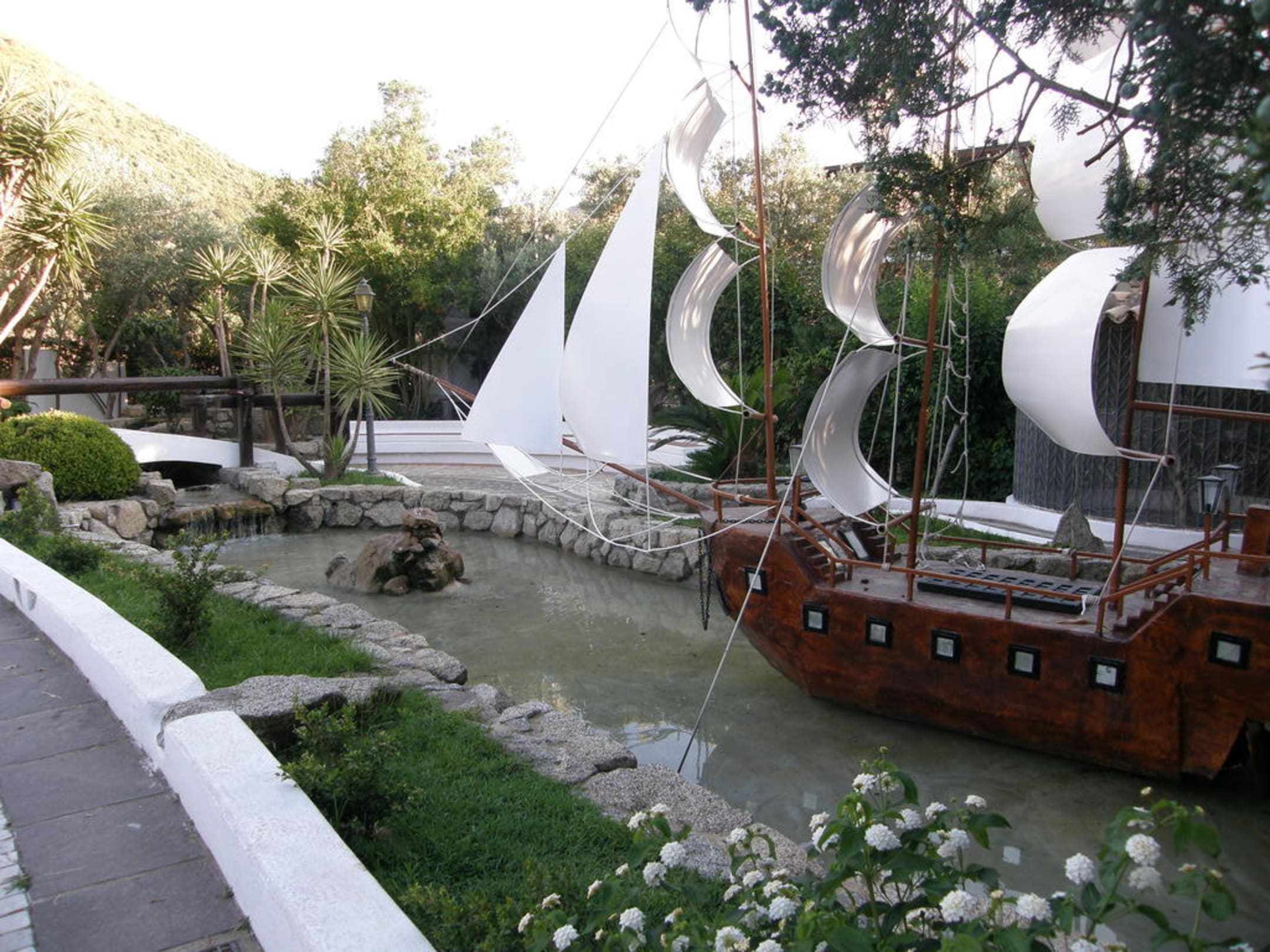 Vor dem Haus ist ein kleiner Bachlauf angelegt und in dem kleinen Teich, in dem er mit einem kleinen Wasserfall sprudelt, steht dieser Nachbau der St. Maria - einfach romantisch