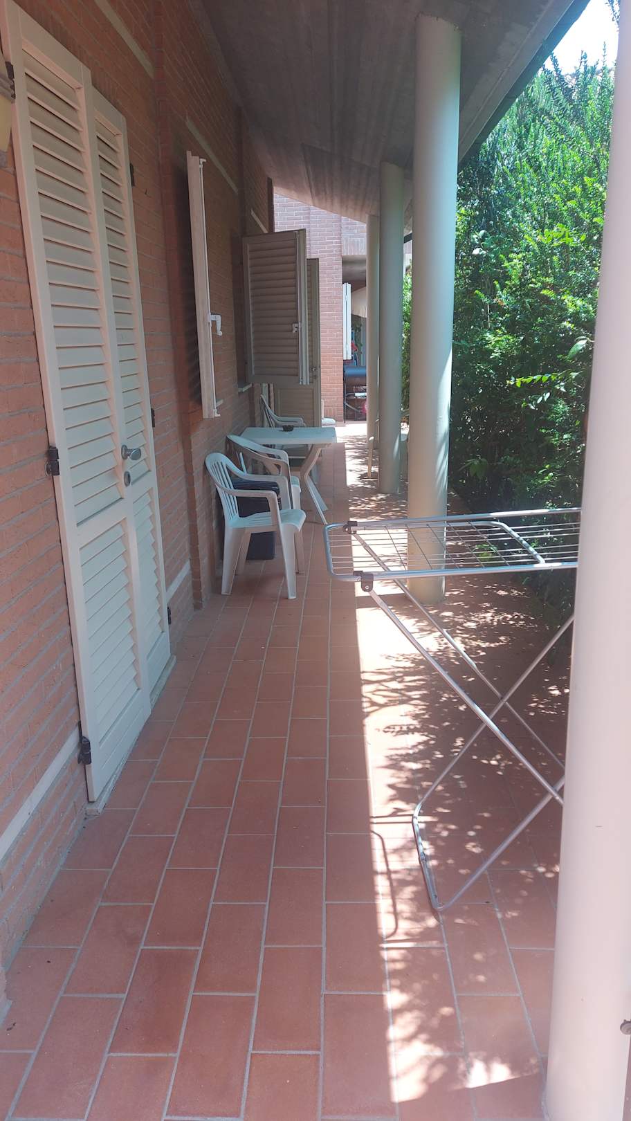 Minimaler Platz zum sitzen. Blick in die Hecke. Durchgang zum nächsten Häuschen.