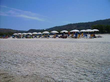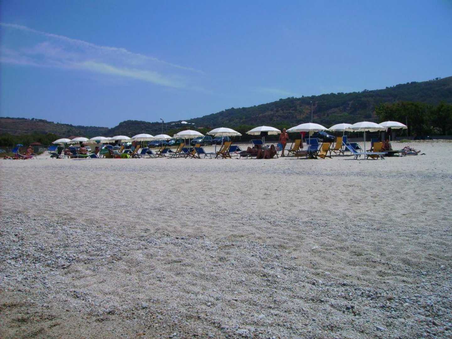 Strand der Residence Sciabache mit Sonnenschirmen und -liegen in der Vorsaison.