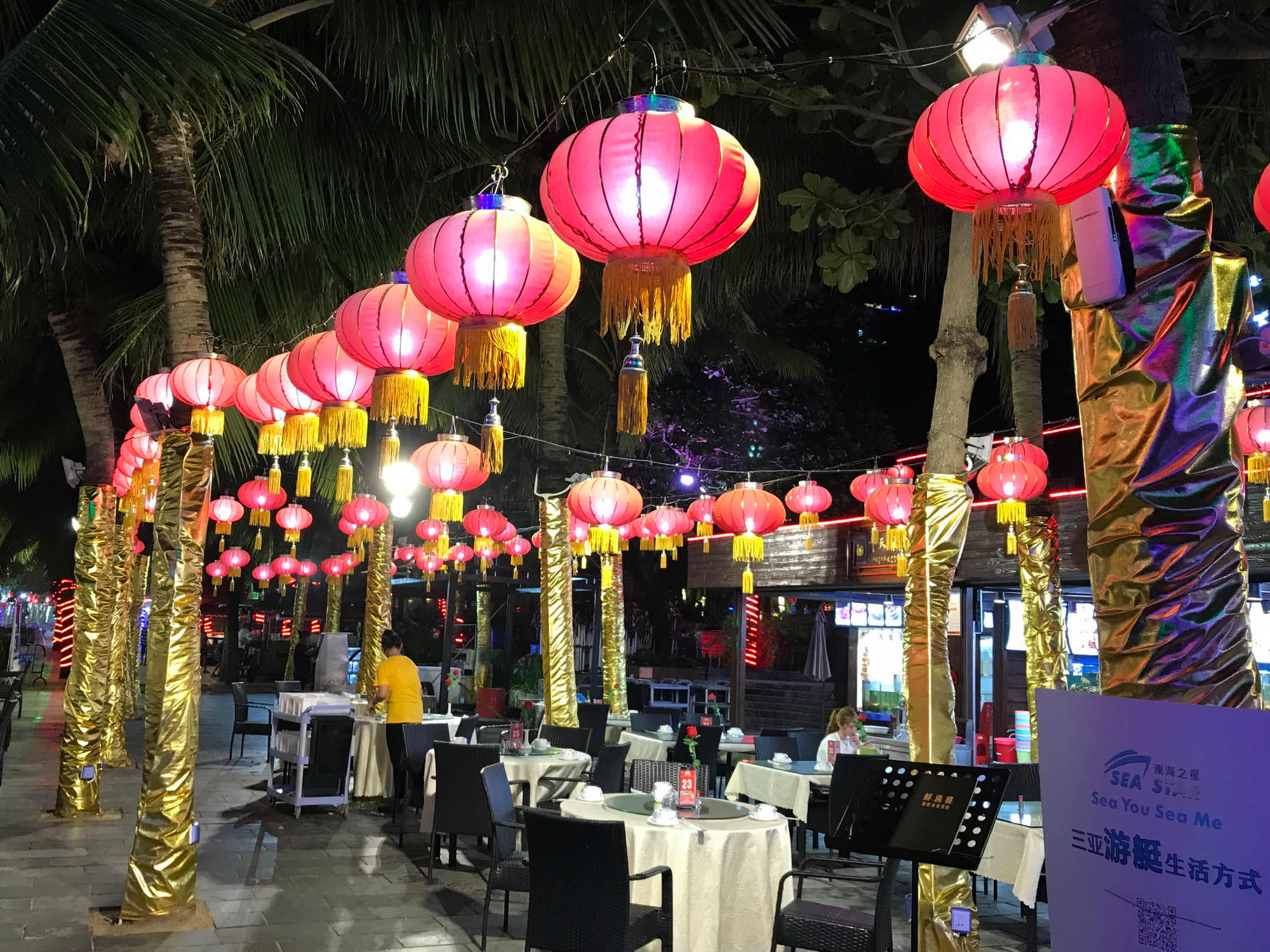 GastroDie "Fressmeile" am Strand entlang. Viele Stände und Restaurants, viele (teils noch lebendige) Speisen, meist schön gemacht, teils mit Musik.