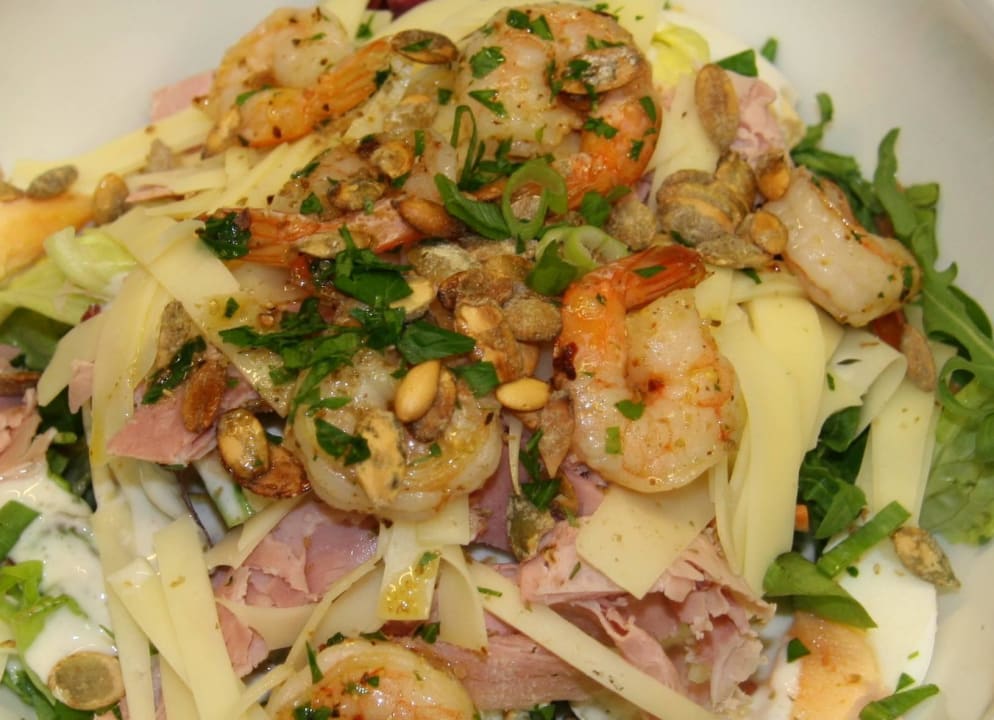 Chefsalat mit Joghurtdressing, Garnelen, Schinken