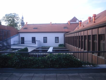 Raucherterasse mit Blick auf den Innenhof-Biergarten des Restaurants Hostinec