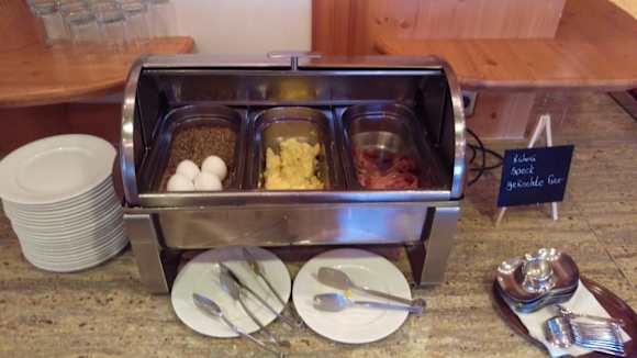 Rührei, Ei, Speck beim Frühstück Buffet