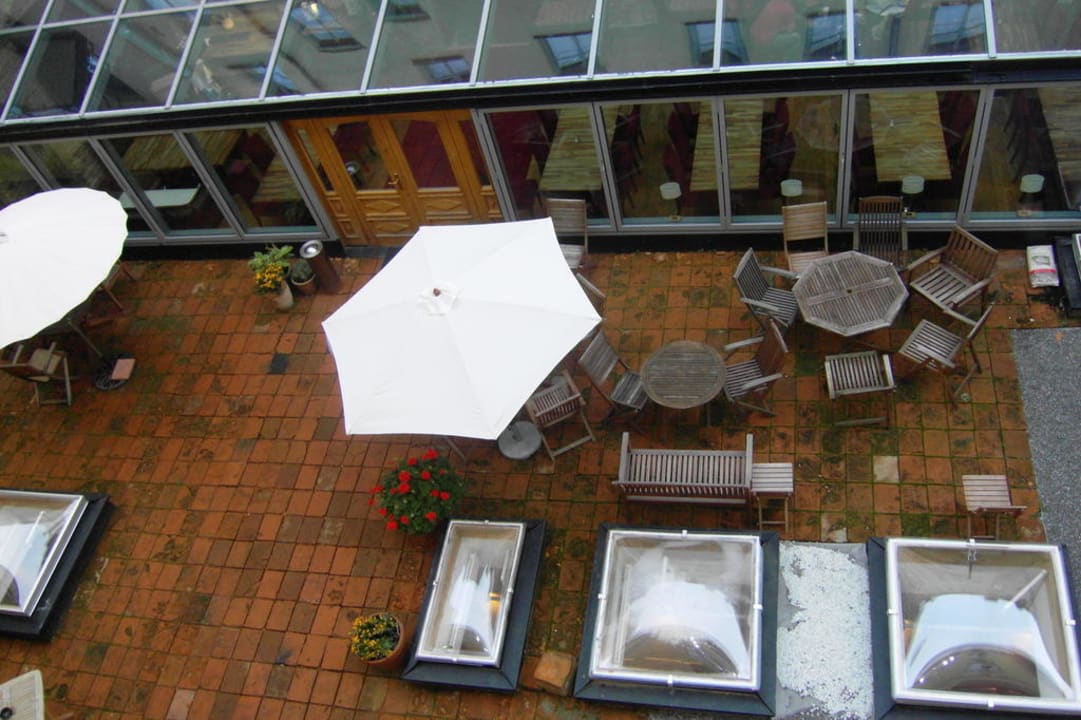 Blick aus dem Zimmer in den Innenhof zum Frühstücksraum und Aussenterasse