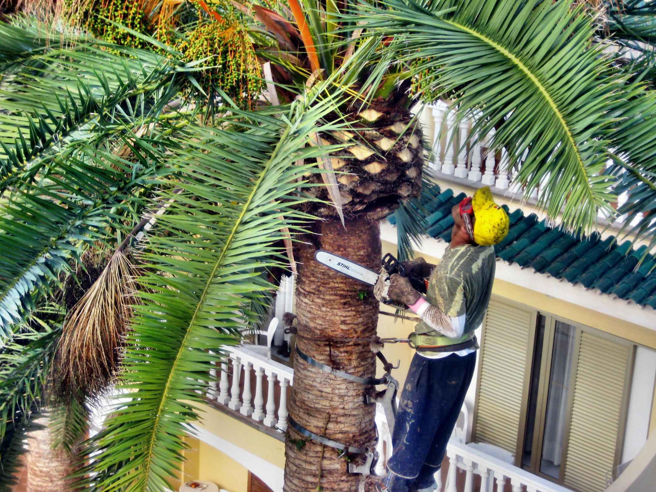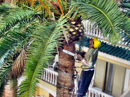 Palmenpflege durch Spezialfirma, schon fast eine artistische Vorführung